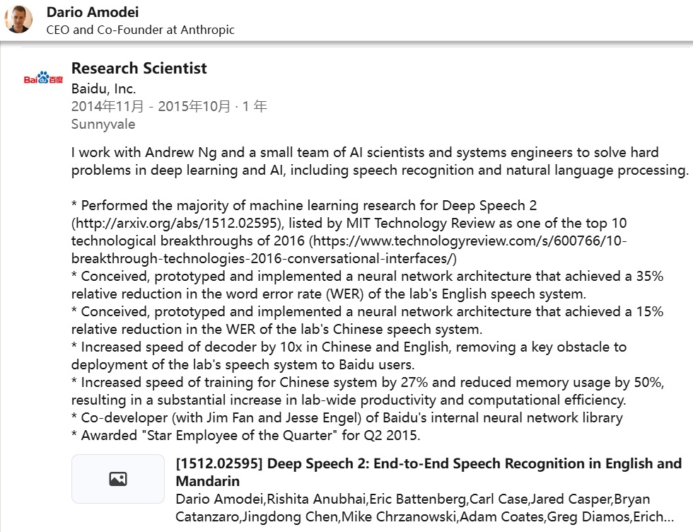 达里奥-阿莫迪的这一决定令人费解,而且从某种程度上来讲,他与中国还颇有渊源。2014年,在斯坦福大学从事博士后研究的他,踏出校园的第一站就是百度硅谷AI实验室,成了人工智能领域大佬吴恩达的手下。